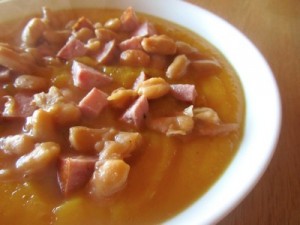 Velouté de potimarron et châtaignes, haricots Tarbais et saucisson à l’ail