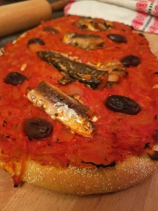 Étaler la pâte à pizza sur la plaque/tole du four; le résultat escompté n’est pas d’obtenir une pâte ultra fine mais au contraire une pâte assez épaisse façon fougasse/focaccia. Recouvrir de garniture tomates/oignons. Déposer les sardines et quelques olives.