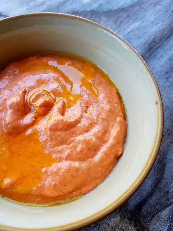 Placer les morceaux de poivrons dans un grand récipient (bol pour mixer) avec l’ail, la feta, le yaourt, une cuillère d’huile d’olive, du paprika et du poivre. Mixer l’ensemble. Rectifier l’assaisonnement en salant si besoin.
