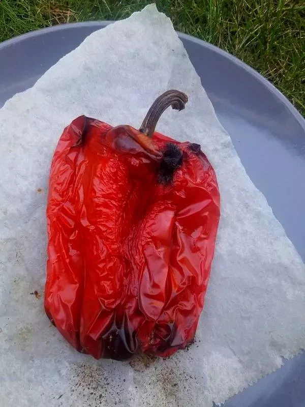 Placer les poivrons entiers sur la plaque ou grille du four et les cuire à 200°C pendant 25-30 minutes environ, jusqu’à ce que la peau commence un peu à noircir. Elle va ainsi pouvoir s’enlever facilement. Laisser les poivrons refroidir avant de les peler, les épépiner. Puis les couper en morceaux.