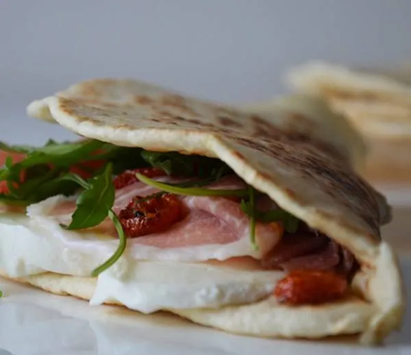 La piadina (piadine au pluriel) est une sorte de pain plat originaire d’Emilie-Romagne en Italie (la belle région gourmande du parseman, balsamique…entre autres) consommé tel un sandwich à emporter #streetfood.
