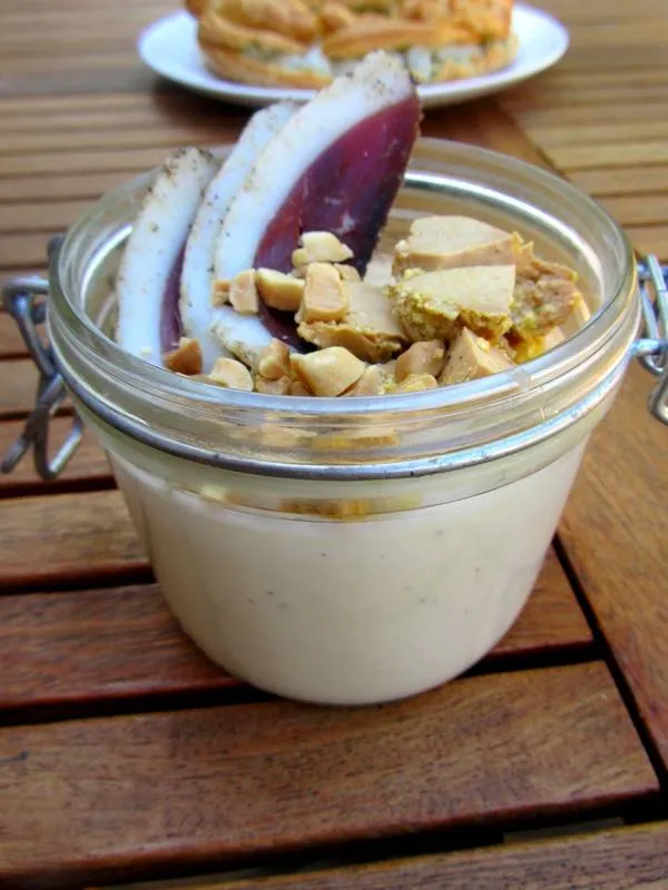 Mousse d’asperges des Landes, dés de foie gras, magret de canard séché et cacahuètes de Soustons