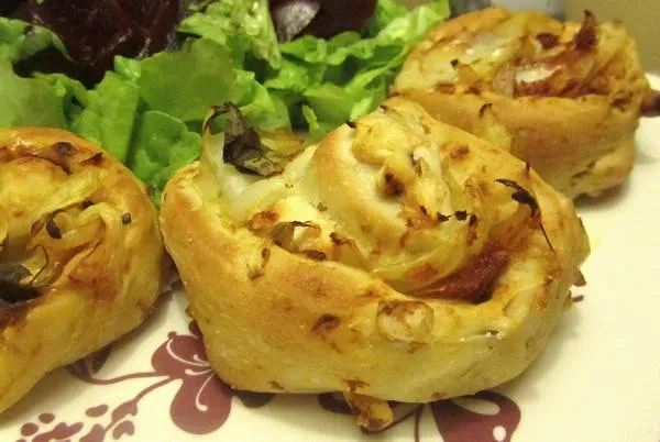 Petits pains-pizzas roulés au poulet, tomates séchées, noix et fromage
