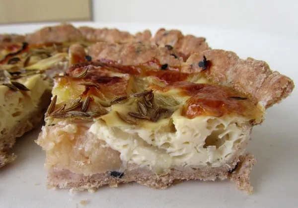 Voici une tarte salée au fromage de brebis mais avec quelques notes sucrées et fruitées. Le cumin vient relever le tout. Essayez.